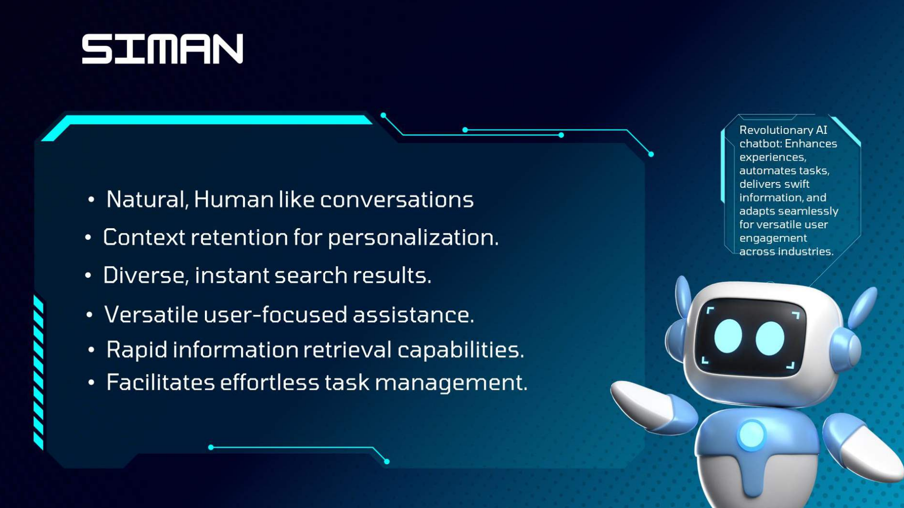 Developed an intelligent chatbot capable of engaging in natural, context-aware conversations. Integrated features such as short-term memory retention and real-time information retrieval from sources like Google, Wikipedia, and Maps. Designed to function as a helpful assistant and deployed as part of a larger web-based user experience.