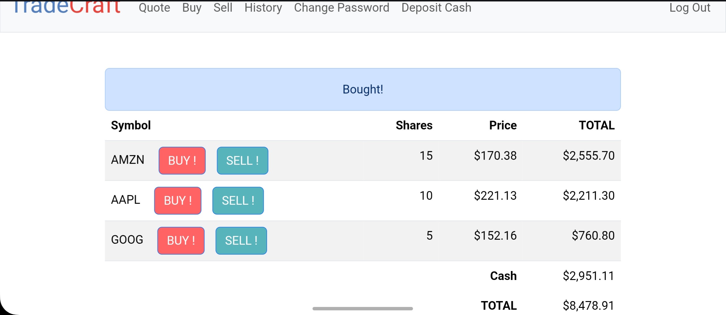 TradeCraft allows users to trade stocks in real time prices with a $10,000 virtual balance. Built using Flask, Jinja, HTML/CSS/JS, and SQLite3. Practice the market. Sharpen your strategy.